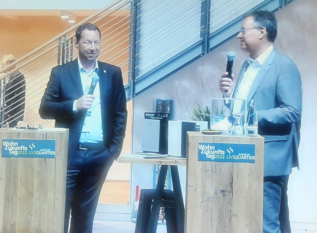 GdW Präsident Axel Gedaschko & Organisator Joachim Eckert präsentieren das Haus der Zukunft in Berlin beim WohnZukunftsTag 2022